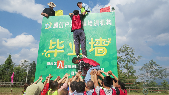 活動中,攀爬4米高的垂直畢業(yè)墻是團(tuán)隊感觸最深的項目,充當(dāng)“人墻”角色的隊員在咬牙堅持著,一次又一次運送隊友上墻,當(dāng)語言交流造成了違規(guī)之后,教練要求隊長和副隊長要接受30個俯臥撐處罰,隊長和副隊長堅持做完了俯臥撐,并堅定地說,“我們無悔因擔(dān)任隊長而受到的處罰,我們選擇繼續(xù)挑戰(zhàn)”,正是在團(tuán)隊的幫助和堅持下,大家齊心協(xié)力,在確保安全第一原則下,最終完成任務(wù),順利“畢業(yè)”。