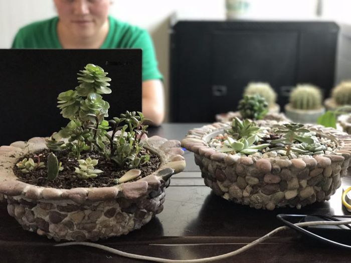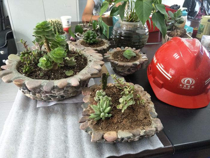 技術(shù)支持: 方森科技 今天晚飯時經(jīng)過材料室,無意間發(fā)現(xiàn)袁老師傅和小尤拿著一桶小石子和小半袋水泥在那搗鼓著什么,仔細(xì)一看,眼前的一幕讓我眼前一亮,只見他們一人拿著小鏟子兌著水?dāng)嚢杷啵蝗嗽谒芰虾兄車鷶[上小石子,不一會兒的功夫,一個個漂亮的小花盆閃亮登場啦。別說,這用塑料盒、水泥和小石子做出來的花盆還真是漂亮,再放上泥土,種上多肉植物,擺放在辦公桌上,真是這繁忙的項目駐地處里的“一股清流”啊。細(xì)問才知道,原來,這些漂亮花盆的材料都是“原生態(tài)”來的,塑料盒是吃完洗干凈的塑料飯盒,水泥是他們在水泥車卸貨的時候掃下來的水泥渣,就連小石子也都是從澄江邊上撿回來的。利用這些材料,袁老師傅和小尤親手“打造”出了辦公室里的一道靚麗的風(fēng)景。