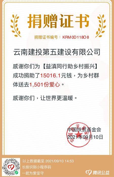 9月10日下午2點(diǎn),一張捐贈(zèng)證書(shū)新鮮出爐。公司787名黨員、干部、職工及家屬,僅用一天時(shí)間,為“益滇同行助力鄉(xiāng)村振興”活動(dòng)籌集善款共計(jì)15016.1元,在云南建投集團(tuán)募捐榜位列第二。