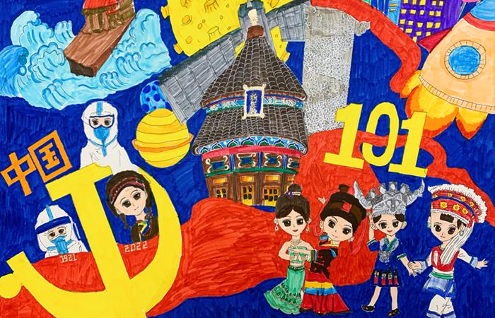 • 寓意:此畫旨在倡導我們要從小“知黨恩、聽黨話、跟黨走”,自覺踐行社會主義核心價值觀,弘揚“紅船精神”,為實現(xiàn)中華民族偉大復興的中國夢而努力奮斗。小作者用自己手中的畫筆將心中對祖國的熱愛與崇敬,對黨的信仰,通過繪畫Q版的少數(shù)民族來表達56個民族一家親,表達中國人民的團結(jié)奮進,還有我們的抗疫英雄,北京的歷史宮殿祈年殿來表達我們偉大祖國的歷史文化底蘊,通過繪畫現(xiàn)代高樓、月球、火箭等表達祖國現(xiàn)今的飛速發(fā)展和實力,輕輕飛舞的紅絲帶、黨徽、紅船,沉甸甸的展現(xiàn)出我們的百年大黨,提醒我們不忘初心 砥礪奮進。通過喜迎二十大、永遠跟黨走、奮進新征程、爭做好少年,體會到小作者愛國愛黨愛社會主義,胸懷祖國,爭當好少年,最美的信仰在心中。用畫作來感悟偉大祖國的巨變,為生為中國人而感到驕傲和自豪,傳達愛國情懷。