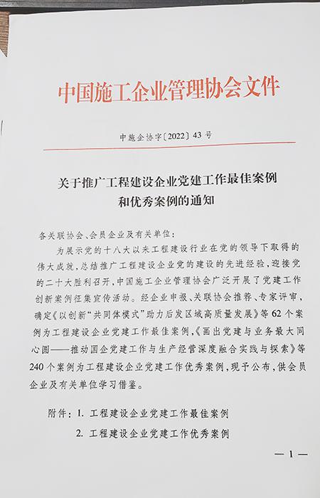 近日,中國施工企業(yè)管理協(xié)會開展了黨建工作創(chuàng)新案例征集宣傳活動,經(jīng)過專家評審,公司申報的《以“12345”黨建工作思路引領(lǐng)高質(zhì)量發(fā)展》入選“工程建設(shè)企業(yè)黨建工作優(yōu)秀案例”。