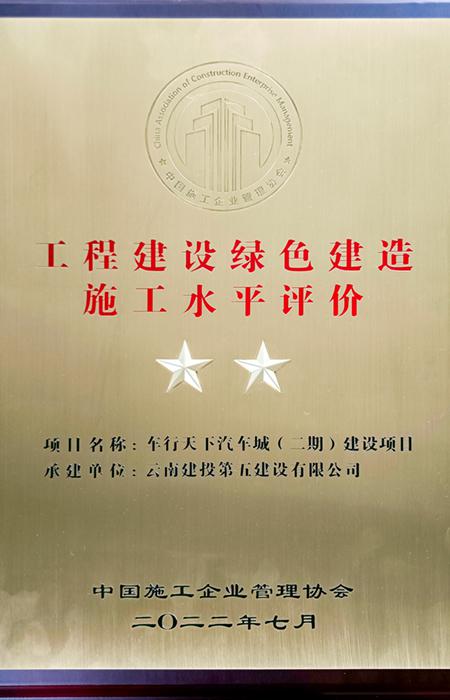 近日,中國(guó)施工企業(yè)管理協(xié)會(huì)發(fā)布了2022年“工程建設(shè)綠色建造施工水平評(píng)價(jià)”結(jié)果,公司車行天下汽車城(二期)建設(shè)項(xiàng)目獲二星評(píng)價(jià)。