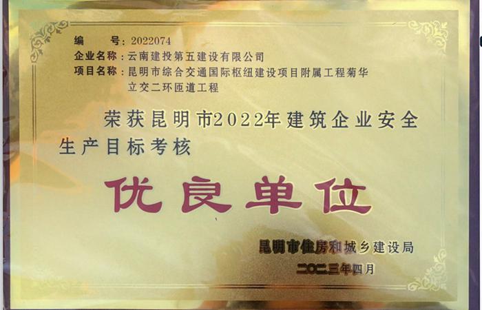 近日,由路橋一部承建的昆明市綜合交通國際樞紐建設項目附屬工程菊華立交二環(huán)匝道工程,榮獲昆明市2022年建筑企業(yè)安全生產目標考核優(yōu)良單位,項目經理常勇、項目安全負責人繆坤宏榮獲昆明市2022年建筑企業(yè)安全生產優(yōu)秀個人稱號。
