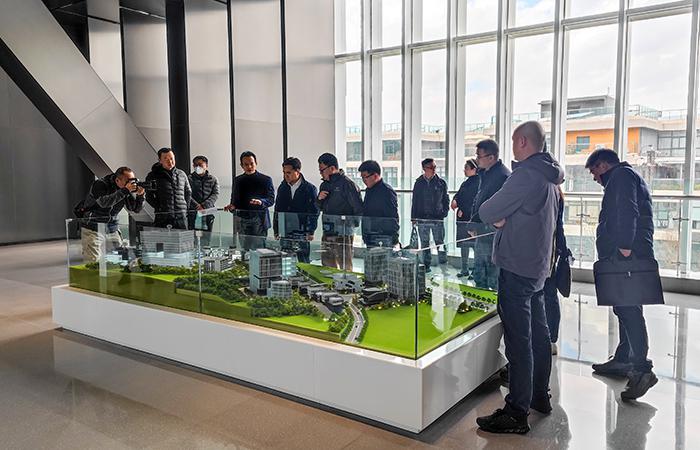 陳江一行來到項目2棟招商引資展示廳和4棟樣板施工現(xiàn)場,聽取項目介紹,充分肯定了項目施工進(jìn)度、質(zhì)量、安全、經(jīng)濟(jì)、安全文明管理成績。