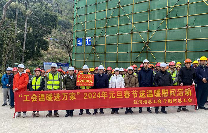 心系職工,情暖一線。1月23日,龍年新春佳節(jié)即將來臨之際,紅河州總工會黨組書記、常務(wù)副主席姜云,個舊市人大常委會副主任、市總工會主席許雪梅率慰問組到公司第二直管項目部負責施工的個舊市工人療養(yǎng)院提升改造項目開展“工會溫暖進萬家”2024年元旦春節(jié)送溫暖慰問活動。