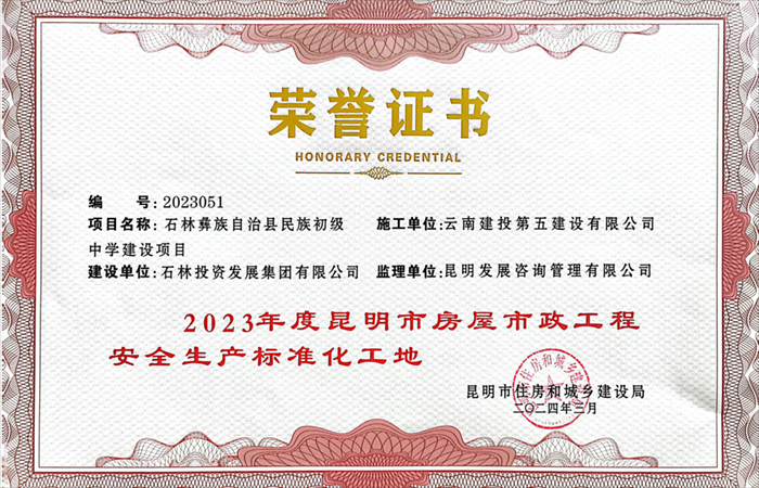 近日,由五〇二直管項(xiàng)目部負(fù)責(zé)施工的石林彝族自治縣民族初級(jí)中學(xué)建設(shè)項(xiàng)目獲評(píng)“昆明市2023年建筑企業(yè)目標(biāo)考核優(yōu)良單位”、“2023年昆明市房屋市政工程質(zhì)量標(biāo)準(zhǔn)化示范項(xiàng)目”、“2023年昆明市房屋市政工程安全生產(chǎn)標(biāo)準(zhǔn)化工地”等榮譽(yù)。