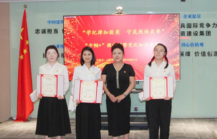 公司“幸福五建”代表隊,由公司五〇四直管項目部黨支部書記張博、團委副書記相莊潔、云南昌達裝飾工程有限公司職工白若晗組成,以微黨課、黨紀知識競賽綜合得分115分榮獲“一等獎”。