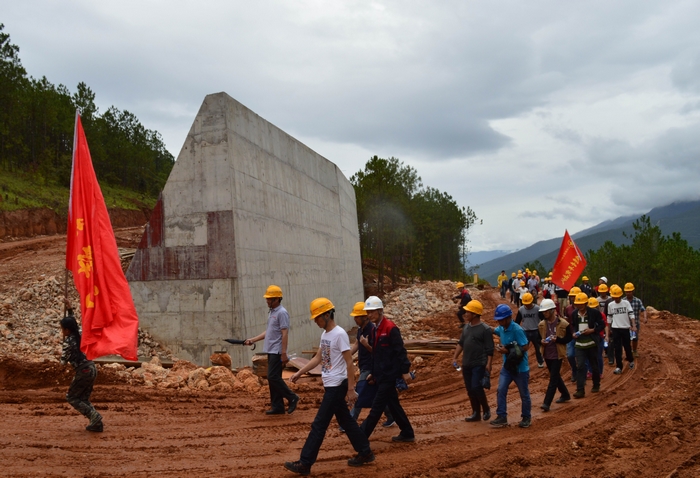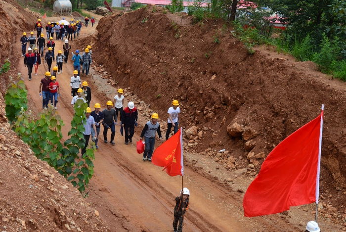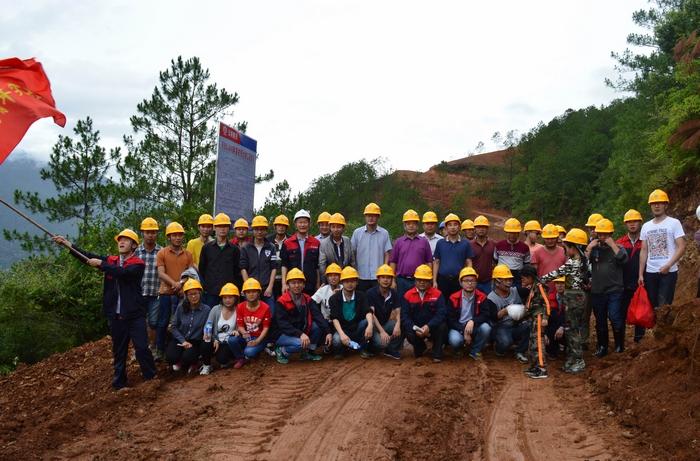 徒步隊伍中還有兩個放假來到工地探望父母的小旗手,其中大一點的小旗手扛著項目部的青年突擊隊隊旗走完全程,小一點的在父母及項目部叔叔的幫助下也走完了全程。徒步隊伍走到半路時,還與前來項目調(diào)研的公司領(lǐng)導(dǎo)不期而遇,大家一起在貫通的便道中途合了影,為整個行程留下了美好的回憶。