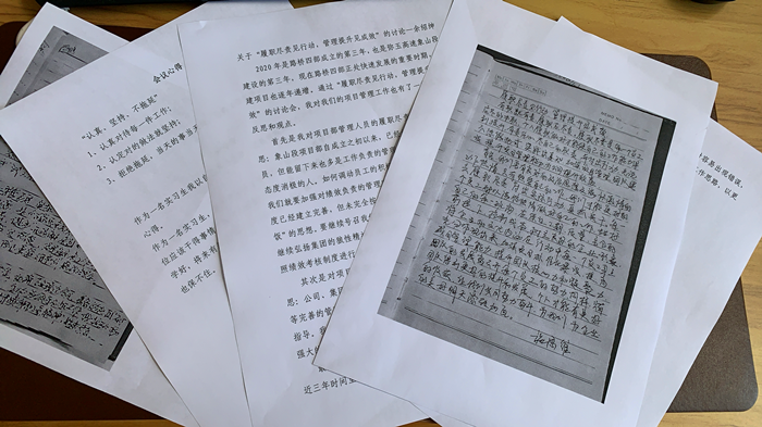 各管理人員積極主動(dòng)撰寫(xiě)心得體會(huì):施工員余紹紳對(duì)過(guò)去三年的工作生涯進(jìn)行了反思、對(duì)項(xiàng)目管理存在的問(wèn)題進(jìn)行細(xì)致的剖析;對(duì)調(diào)動(dòng)員工積極性,消除懈怠的思想、管理提升如何見(jiàn)成效方面提出了自己的看法,表示要繼續(xù)號(hào)召全體管理人員樹(shù)立憂患意識(shí),對(duì)不作為、不擔(dān)當(dāng)?shù)娜藛T,依照績(jī)效考核制度進(jìn)行管理。預(yù)算員普夢(mèng)麗表示要認(rèn)真履職盡責(zé),做好自己的本職工作,正視自己的問(wèn)題,不給領(lǐng)導(dǎo)和同事制造問(wèn)題,增加他人的工作量,在有限的時(shí)間和精力里面做效率最高的事情。而剛踏上工作崗位的材料員譚夢(mèng)林,意識(shí)到目前要盡快掌握崗位技能,以便應(yīng)對(duì)今后新項(xiàng)目的挑戰(zhàn);頂崗鍛煉實(shí)習(xí)生劉海波則認(rèn)為做人要堅(jiān)守本心,堅(jiān)持自我,做事就要做到在其位,謀其職。在保證質(zhì)量安全方面,質(zhì)檢員施思維也有自己的看法:有職就有責(zé),履職應(yīng)盡責(zé),質(zhì)量安全工作容不得一點(diǎn)點(diǎn)馬虎......