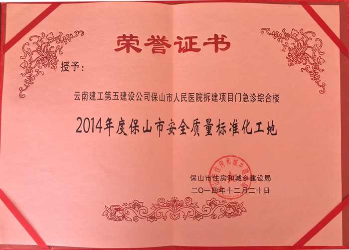 技術(shù)支持: 方森科技 3月27日,保山市住建局組織召開全市建筑業(yè)管理暨工程質(zhì)量安全監(jiān)管工作會(huì)議,對(duì)2014年度在工程質(zhì)量安全監(jiān)管工作上取得優(yōu)異成績(jī)的單位進(jìn)行表彰。其中,由公司第四直管項(xiàng)目部施工的保山市人民醫(yī)院遷建項(xiàng)目被授予“2014年度保山市安全質(zhì)量標(biāo)準(zhǔn)化工地”榮譽(yù)稱號(hào)。