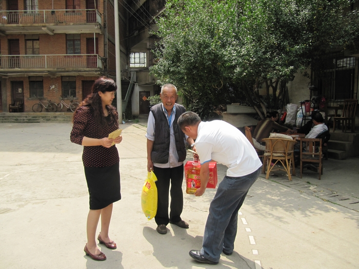 首先慰問的是直管部退休老職工李學智,今年73歲,一直單身,膝下無子女,獨自生活在宿舍區(qū),一直以來直管部領(lǐng)導都特別關(guān)心他的生活起居,除節(jié)假日以外都會抽時間去看望他,我們?nèi)サ剿視r,他剛好午睡完,看見我手里拿著相機,他沒接我們遞給他的慰問品,反而一本正經(jīng)地跟我說:“等一下,我穿好衣服戴上帽子再照可以嗎?”說著急急忙忙去穿外衣,帶上帽子才來接收,我們幾個都被他逗樂了,在帶給他領(lǐng)導的問候和了解了他最近的生活和身體情況后,他說:“真的很感謝啊……”之后的話語由于方言和語速沒聽太清,但是我發(fā)現(xiàn)他的眼眶噙滿了淚水。其實我們很清楚老人為什么會這樣的舉動,今年7月14日凌晨2點,老人疼痛難耐,被直管部保安發(fā)現(xiàn),負責保衛(wèi)后勤的李本紅及時將老人送到西山區(qū)第一人民醫(yī)院,經(jīng)診斷老人患了急性胃穿孔,連夜手術(shù)保住了性命,手術(shù)全程以及之后的所有住院手續(xù)都是直管部負責陪護和辦理。