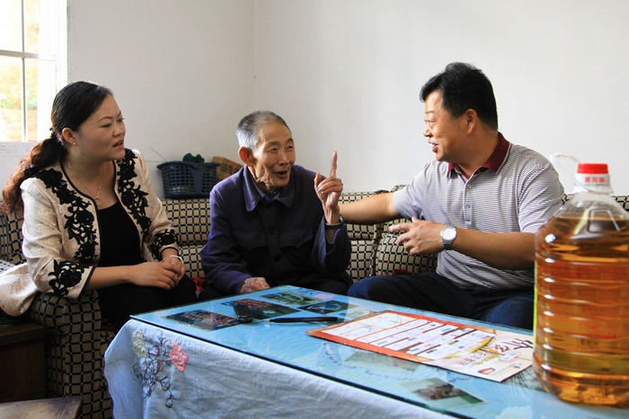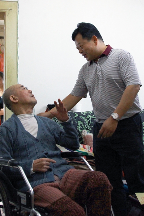 “別起來,別起來,您躺著就行了?!币坏酵诵萋毠S瑞泉老人家里時,老人便迫不及待地想要起身迎接,李興奎趕緊到臥室去幫忙攙扶。黃瑞泉患有腦梗且偏癱多年,生活不能自理,在其老伴的幫助下坐上輪椅來到了客廳。李興奎仔細詢問了黃瑞泉的身體狀況和其子女的相關情況,并向黃瑞泉老人送上了節(jié)日慰問金,“這是公司的一點心意,預祝你們節(jié)日愉快!你要好好休息,保重身體,有什么困難就向退管會反映,我們一定會盡力幫助解決?!?71歲的黃瑞泉顫顫巍巍地拉著李興奎的手不斷地道謝:“謝謝你們!謝謝書記!”