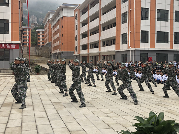 同學(xué)們在平整潔凈的青石地板上進(jìn)行軍訓(xùn)匯報演出