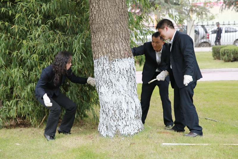 2012年11月7日下午,物業(yè)管理公司全體員工為公司機(jī)關(guān)的綠化樹刷石灰水,刷好的樹木遠(yuǎn)遠(yuǎn)看去,整齊而又漂亮。物業(yè)管理公司將在正常開展工作的情況下,對公司機(jī)關(guān)及小團(tuán)山生活區(qū)的綠化樹進(jìn)行粉刷行動(dòng),通過這次行動(dòng)來美化職工生活區(qū),喜迎黨的十八大勝利召開。