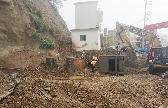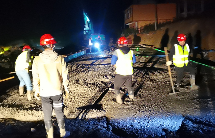 巧家三水廠項(xiàng)目“雙節(jié)”期間因巧家突降數(shù)十年未遇大暴雨,新龍洞及伍家溝進(jìn)場(chǎng)道路因塌方而受阻。項(xiàng)目班子團(tuán)隊(duì)快速反應(yīng),將主要管理人員分為兩支隊(duì)伍,一支隊(duì)伍指揮夜以繼日搶修擋墻并快速清理泥石流;另一支隊(duì)伍緊鑼密鼓進(jìn)行隧道施工。經(jīng)過(guò)幾天日夜奮戰(zhàn),項(xiàng)目完成道路清通的同時(shí)順利完成隧道開挖支護(hù)70米。