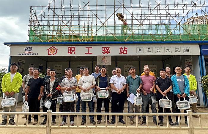 8月15-17日,第七直管項目部工會先后到云南藝術(shù)學(xué)院、輕紡職業(yè)學(xué)院等在建項目開展“工會溫暖進萬家”送清涼活動,為堅守項目一線的職工送去小風(fēng)扇、防曬袖套、清涼油、花露水等“清涼大禮包”?;顒又?,直管部工會主席向一線職工講解夏季防暑降溫的小常識,分享預(yù)防蚊蟲叮咬的小妙招,囑咐大家要做好防暑降溫工作,合理安排好高溫工作時間,注意自身健康,謹(jǐn)防高溫中暑。要求項目部要把健康安全放首位,注意食堂衛(wèi)生、菜品?!?