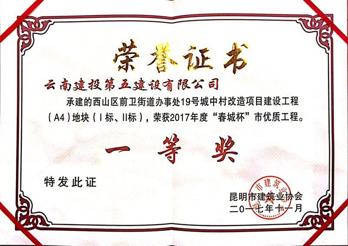直五部潤城19#地塊項(xiàng)目喜獲“春城杯”優(yōu)質(zhì)工程獎(jiǎng)
