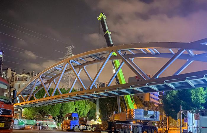 白龍路石閘立交過街人行天橋主梁吊裝完成