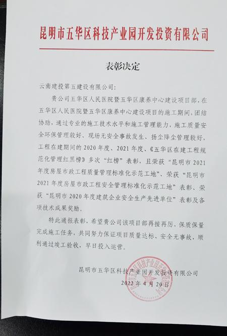 近日,公司收到昆明市五華區(qū)科技產(chǎn)業(yè)園開發(fā)投資有限公司的表彰文件,對第三直管部施工的五華區(qū)人民醫(yī)院暨五華區(qū)康養(yǎng)中心建設(shè)項目表示肯定。文件中指出,五華區(qū)人民醫(yī)院項目在施工期間,通過專業(yè)的施工技術(shù)水平和施工管理能力,使得工程的質(zhì)量較好,施工現(xiàn)場的安全環(huán)保管理情況較好、現(xiàn)場無安全事故發(fā)生、揚塵降塵效果較好,在2020年度、2021年度榮獲多項表彰,希望項目部再接再厲,保質(zhì)保量完成施工任務(wù)。 五華區(qū)人民醫(yī)院…